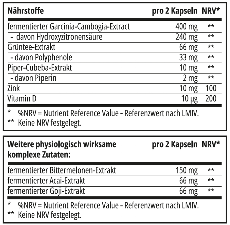 Groene thee-extract levert waardevolle polyfenolen (EGCG) die de vetverbranding stimuleren en het energieverbruik verhogen. Garcinia Cambogia ondersteunt de controle van de eetlust, terwijl Coleus forskohlii de energiestofwisseling op cellulair niveau activeert. Bittermeloen en zink dragen bij aan het behoud van een gezonde stofwisseling, terwijl vitamine B6 de energiestofwisseling extra ondersteunt en vermoeidheid vermindert.